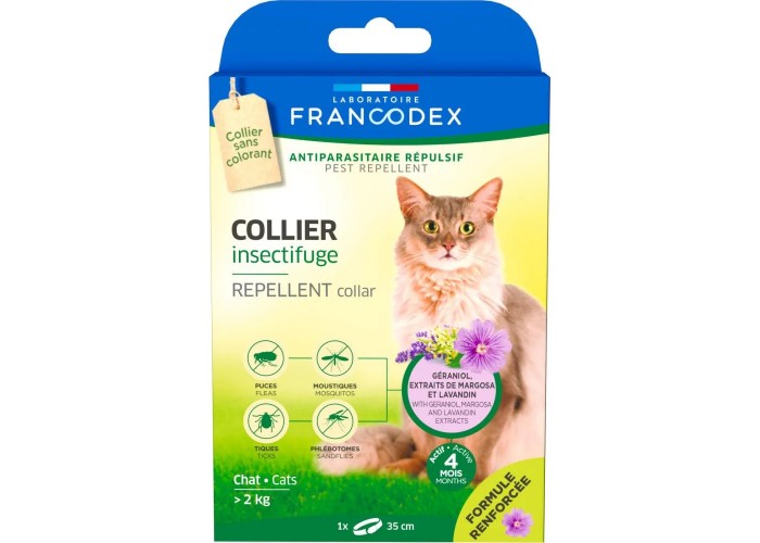 Нашийник FRANCODEX Repellent Collar — ефективний засіб захисту дорослих котів від бліх, кліщів та комарів. Завдяки натуральним екстрактам гераніолу, маргози та лаванди, нашийник не тільки відлякує паразитів, а й знімає свербіж та подразнення шкіри, усуваючи неприємний запах. Він виготовлений без ПВХ і фталатів, водостійкий і забезпечує захист протягом 4 місяців. Система безпеки дозволяє нашийнику розірватися у разі удушення. Довжина — 35 см. Застосування просте: розгорнути, застебнути на шиї, не затягуючи сильно, обрізати зайве. Не підходить кошенятам до 4 місяців. Можлива алергічна реакція. Зберігати в недоступному для дітей місці.