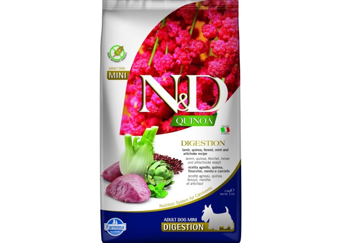 Сухой корм для собак Farmina N&D 2.5 кг Quinoa Digestion Adult Mini Lamb & Fennel – беззерновой диетический рацион для мелких пород с чувствительным пищеварением. Формула содержит нежный ягненок, киноа и полезные травы – фенхель, мяту и артишок, способствующие нормализации желудочно-кишечного тракта, поддержанию печени и желчевыводящих путей. Кино обеспечивает ценные аминокислоты, легкоусвояемый белок и энергию для активности, а пребиотики (инулин и ФОС) поддерживают баланс микрофлоры кишечника. Глюкозамин и хондроитин заботятся о здоровье суставов и хрящевой ткани, обеспечивая подвижность. Экстракты зеленого чая и розмарина укрепляют иммунитет. Корм не содержит глютена, искусственных добавок и консервантов, обеспечивая безопасное и сбалансированное питание, поддерживающее здоровье пищеварительной системы, активность и общее благосостояние маленьких собак ежедневно.