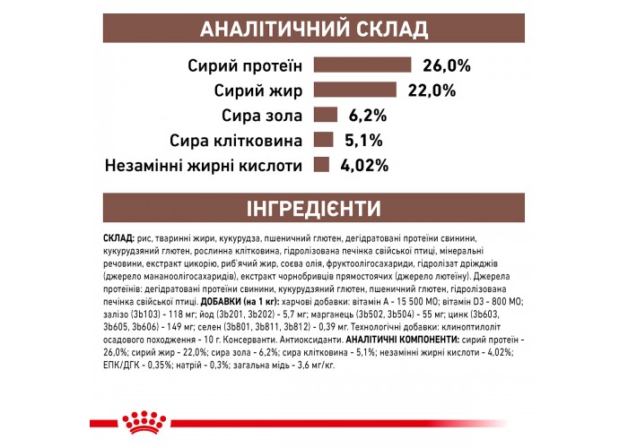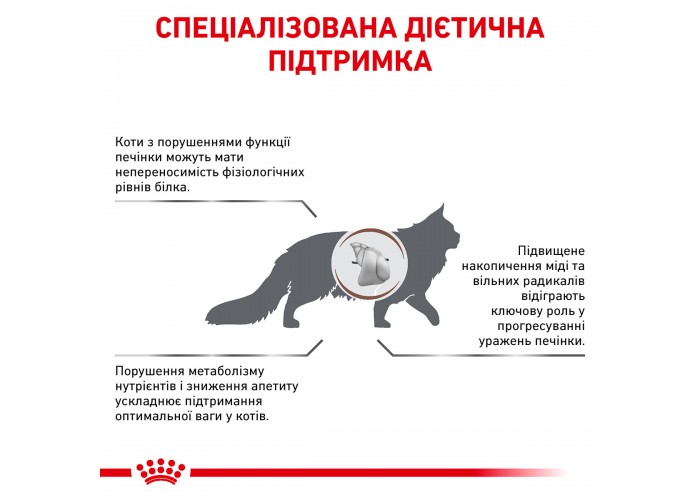 Royal Canin (Роял Канін) Hepatic - це сухий лікувальний корм супер-преміум класу, спеціально розроблений для котів із захворюваннями печінки. Термін дієтотерапії визначається типом патології, але при хронічних захворюваннях рекомендується використовувати корм протягом життя тварини. Розподіл їжі на кілька порцій знижує навантаження печінку. Показання для застосування включають холангіогепатит, портокавальне шунтування, печінкову енцефалопатію та інші. Переваги корму включають високий рівень енергії, що відповідає потребам хворої тварини, підвищену смакову привабливість, що стимулює апетит, та знижений вміст міді, що важливо для зменшення негативних ефектів холестазу. Крім того, комплекс антиоксидантів допомагає уповільнити процес деградації гепатоцитів, які відіграють ключову роль у патогенезі захворювань печінки.