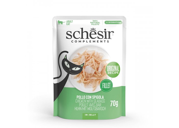 Schesir Cat Chicken & Seabass — вологий корм для кішок, виготовлений із ретельно відібраних натуральних інгредієнтів, що забезпечують здорове та збалансоване харчування кішок. Цей корм для кішок складається з ніжних шматочків курки і морського окуня в пікантному бульйоні, що робить його смачною стравою, яка сподобається вашій кішці. готується у власному бульйоні, щоб зберегти свій природний смак та поживні речовини. Курка є відмінним джерелом білка, який важливий для підтримки сильних м'язів та загального стану здоров'я кішок.