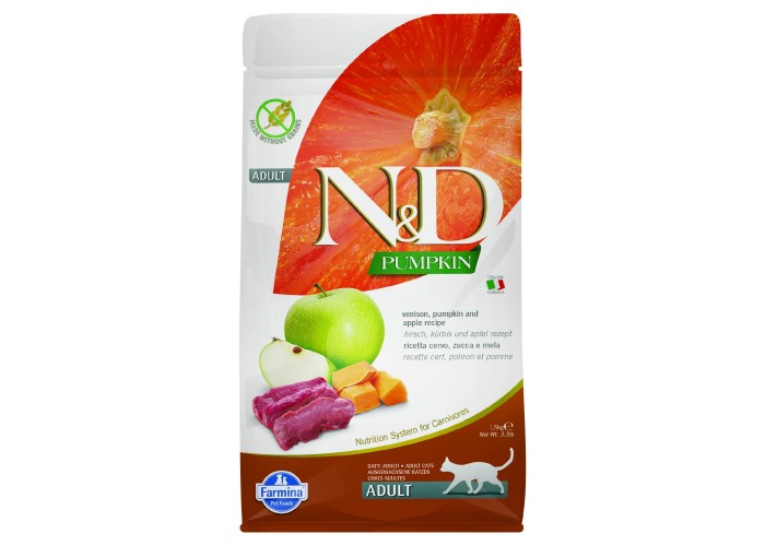 Farmina N&D Pumpkin Grain Free Adult Venison & Apple — це повнораціонний беззерновий сухий корм холістик класу для дорослих котів, розроблений з урахуванням природних потреб хижаків. Основним джерелом тваринного білка є оленина — дієтичне м’ясо з високою поживною цінністю, яке добре засвоюється та підходить котам із чутливим травленням або схильністю до алергій. Формула корму містить 96% білка тваринного походження та не містить злаків, штучних консервантів, барвників і ГМО.