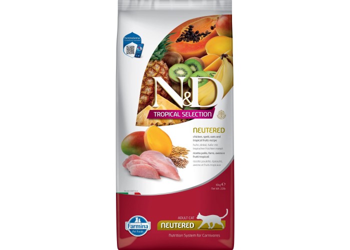 Farmina Cat Low Grain Tropical Adult Neutered - збалансований сухий корм для стерилізованих дорослих котів з куркою та п'ятьма тропічними фруктами: манго, ківі, ананас, папайя та банан. Цей корм N&D CAT TROPICAL SELECTION CHICKEN NEUTERED призначений для підтримки здоров'я вашої стерилізованої кішки. З його допомогою можна боротися зі схильністю до повноти завдяки високому вмісту білка високої якості та карнітину, що сприяє збереженню м'язової маси та ефективному використанню жирів. Зменшена кількість крохмалю та цукру допомагає запобігти переддіабетичним станам.