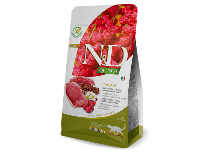 Farmina N&D Quinoa Urinary Adult — дієтичний беззерновий корм для профілактики сечокам'яної хвороби у котів. Формула містить 94% білка тваринного походження, мінімум магнію та стабілізує pH сечі (6,0-6,3), що сприяє розчиненню струвітних каменів.