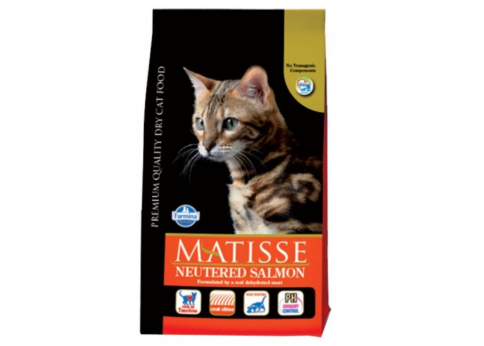 Matisse Cat Neutered Salmon — збалансований сухий корм для стерилізованих котів і кішок. Розроблений фахівцями Farmina спільно з ветеринарними дієтологами, він містить високий відсоток білка з дегідратованого лосося та мінімальну кількість жирів, що допомагає підтримувати оптимальну вагу.
