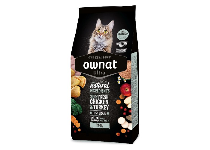 Ownat Ultra Chicken & Turkey — сухий корм для дорослих котів віком до шести років, а також для котів у період вагітності та лактації. Містить 30% свіжого м’яса курки та індички, забезпечуючи високоякісні білки, чудовий смак і легке травлення. Корм збалансований і повноцінний, підходить котам будь-яких порід і розмірів з нормальним рівнем активності. До складу входять натуральні інгредієнти: свіже м’ясо та риба, цільнозерновий рис і пшениця, свіжі фрукти та овочі, морські водорості і ароматичні рослини. Технологія SOFT COOKING передбачає обробку інгредієнтів на пару, що покращує засвоєння вуглеводів і енергії та забезпечує високу біодоступність поживних речовин. Корм не містить штучних барвників і добавок, використовуються лише натуральні консерванти. Він підтримує здорове травлення, оптимальну енергію, блискучу шерсть та загальний тонус котів, враховуючи фізіологічні потреби залежно від віку та стану організму, забезпечуючи збалансований і смачний раціон щодня.