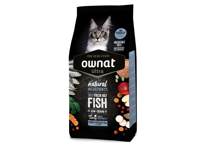 Ownat Ultra Sterilized Fish — сухий корм для стерилізованих котів віком до шести років, розроблений для підтримки оптимальної ваги та задоволення харчових потреб вибагливих тварин. Містить 30% свіжої риби, що забезпечує високоякісні білки, чудовий смак та багатий на омега-3 для здоров’я шкіри та блиску шерсті. Корм багатий на клітковину, яка дає відчуття ситості та допомагає контролювати апетит. Використовуються натуральні, свіжі та локально вирощені інгредієнти: свіже м’ясо та риба, цільнозерновий рис і пшениця, свіжі фрукти та овочі, морські водорості та ароматичні рослини. Технологія SOFT COOKING готує інгредієнти на пару до оптимальної кондиції, забезпечуючи максимальну засвоюваність і легке травлення. Корм містить білки високої біологічної цінності, необхідні амінокислоти, підтримує здоров’я шерсті, імунітет та тонус кота, не містить штучних барвників чи консервантів і підходить для щоденного годування.