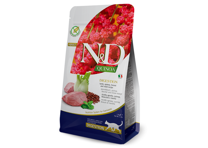 Farmina N&D Quinoa Digestion Lamb&Fennel — повноцінний дієтичний корм для дорослих котів із чутливим травленням. Корм не містить зернових, що можуть викликати алергію, і базується на легкозасвоюваному м'ясі ягняти. До складу входять безглютенове насіння кіноа та фенхель, які заспокоюють травну систему та зменшують здуття живота. Пребіотики (ФОС і МОС) сприяють зростанню корисної мікрофлори, покращують травлення і зміцнюють імунітет, а натуральні антиоксиданти захищають клітини від ушкоджень. Смачний і корисний вибір для підтримки здоров’я вашої кішки!