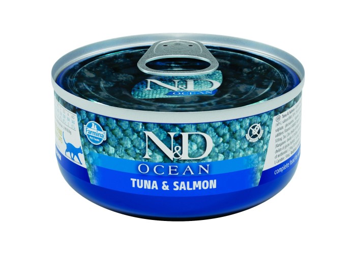 Вологий корм для котів Farmina N&D Ocean Tuna & Salmon Adult 70 г – це беззерновий консервований раціон преміум-класу, створений спеціально для дорослих котів, що цінують натуральний смак і високу якість. Основу корму складають соковиті стейки тунця та ніжне філе лосося, багаті на легкозасвоюваний білок, омега-3 жирні кислоти та необхідні мікроелементи, які підтримують блискучу шерсть, здорову шкіру, міцні м’язи та серцево-судинну систему. Завдяки делікатному приготуванню на парі та стерилізації зберігаються природні смак та аромат рибних інгредієнтів, які коти обожнюють. Корм не містить зернових, штучних загусників, карагінану та BPA, що робить його безпечним навіть для чутливих улюбленців із ніжним травленням. Збалансований комплекс вітамінів і мінералів забезпечує котика необхідною енергією, підтримує загальне здоров’я та дарує відчуття ситості без зайвого навантаження на організм. Farmina N&D Ocean – це поєднання користі, смаку та турботи, яке задовольнить найвибагливішого гурмана та подарує вашому улюбленцю активність і довголіття.