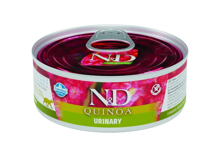 Вологий корм для котів Farmina N&D Quinoa Urinary Duck & Cranberry Adult 80 г – це беззерновий дієтичний раціон, розроблений для профілактики та підтримки здоров’я сечовидільної системи у котів, схильних до утворення струвітних каменів та захворювань нижніх сечових шляхів. До складу входить ніжне м’ясо качки як джерело легкозасвоюваного білка, журавлина з натуральними антиоксидантами та ромашка з протизапальними властивостями, які комплексно підтримують здоров’я сечового міхура та знижують ризик бактеріальних інфекцій. Спеціальні добавки у формулі сприяють підкисленню сечі, запобігаючи утворенню та повторному виникненню струвітних кристалів. Завдяки дбайливому приготуванню на парі та стерилізації корм зберігає природний смак і аромат, роблячи його апетитним навіть для вибагливих котів. У складі немає зернових, штучних загусників, карагінану та BPA, що робить корм безпечним і натуральним.
