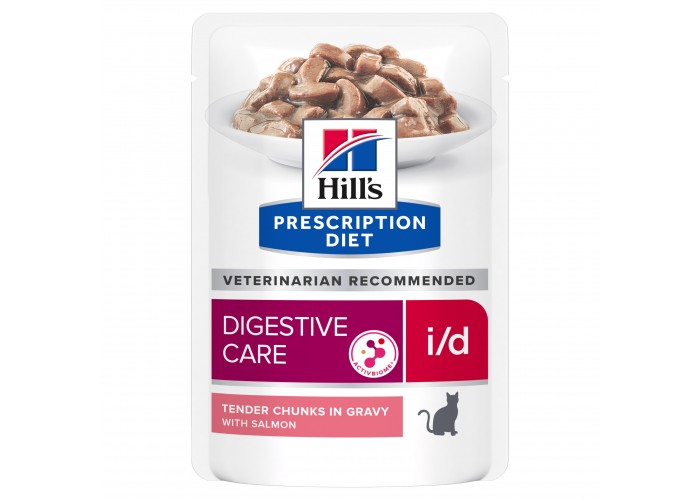 Hill's Prescription Diet i/d вологий корм для котів — це вологий корм, спеціально розроблений для котів із проблемами травлення. На упаковці є безліч символів, які надають важливу інформацію про харчову цінність продукту, інгредієнти та рекомендоване використання.