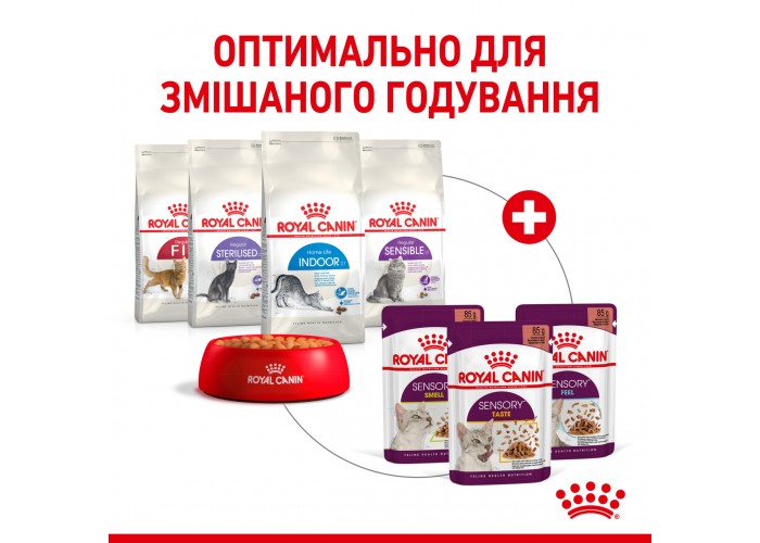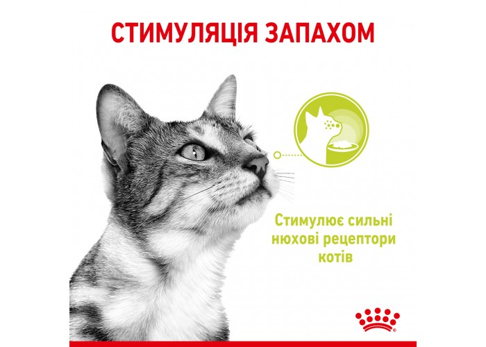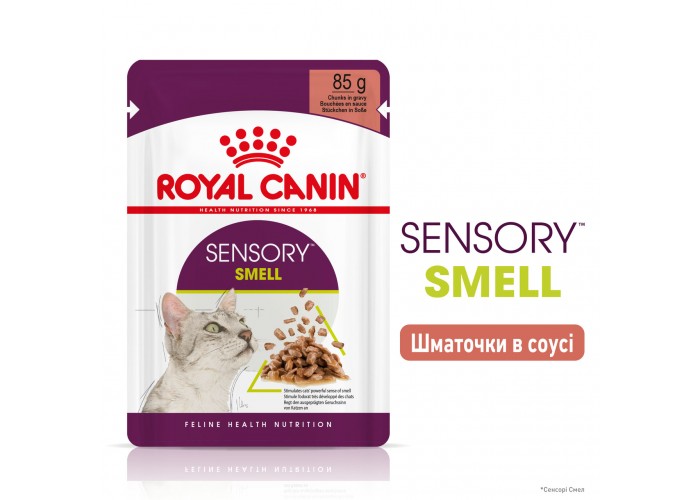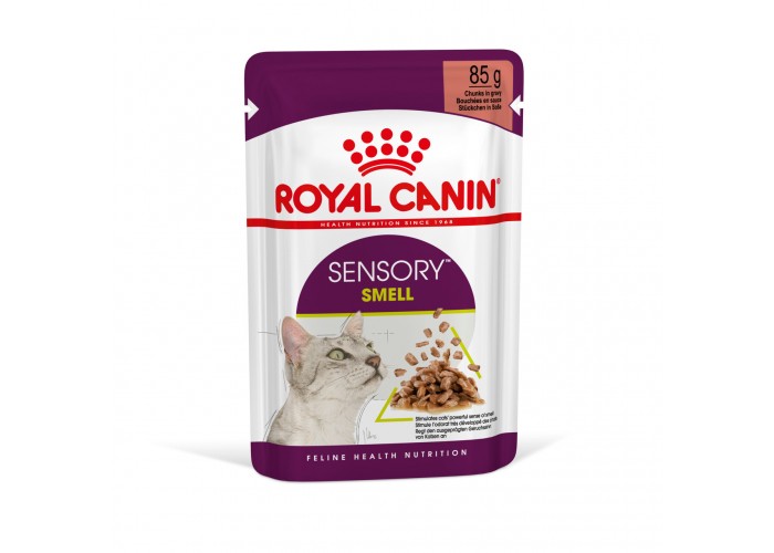 Royal Canin Sensory Smell in Gravy – вологий повнораціонний корм із м’ясом та рибою для дорослих котів, спеціально розроблений для стимуляції нюхових рецепторів і пробудження апетиту у вибагливих тварин. Завдяки унікальному ароматичному профілю корм має особливий запах, що приваблює котів та заохочує їх до їжі. Формула відповідає природним інстинктам тварин і сприяє різноманітності харчування, задовольняючи прагнення до нових смаків і запахів. Шматочки м’яса та риби у ніжному соусі легко споживати навіть котам зі зниженим апетитом, а збалансований склад збагачений необхідними поживними речовинами, вітамінами й мінералами для підтримки гарного самопочуття та енергії. Додатково вологий корм допомагає підтримувати здоров’я сечовидільної системи, сприяючи природній гідратації. Ідеально підходить для щоденного раціону та робить прийоми їжі більш приємними і різноманітними.