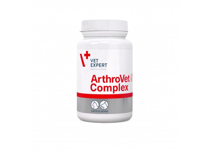 VetExpert ArthroVet Complex - посиленний комплекс для суглобів собак і кішок. Застосовується при артритах, остеоартритах, післяопераційному відновленні та періоді активного росту та формування кісток і хрящів. Має профілактичну та терапевтичну дію, стимулюючи синтез глікозаміногліканів, нормалізуючи обмін речовин у хрящовій тканині та маючи протизапальну дію. Рекомендована доза - 1 таблетка на 20 кг ваги тварини в день, для профілактики - половина дози. Курс лікування - від 1 до 6 місяців без перерви.