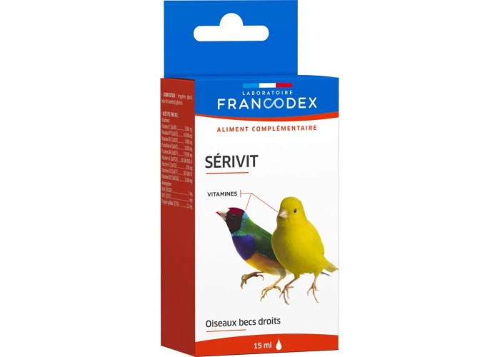 Вітаміни для птахів Francodex Serivit, 15 мл – це спеціальна рідка добавка, розроблена для зерноїдних птахів, що живуть у клітках або вольєрах.