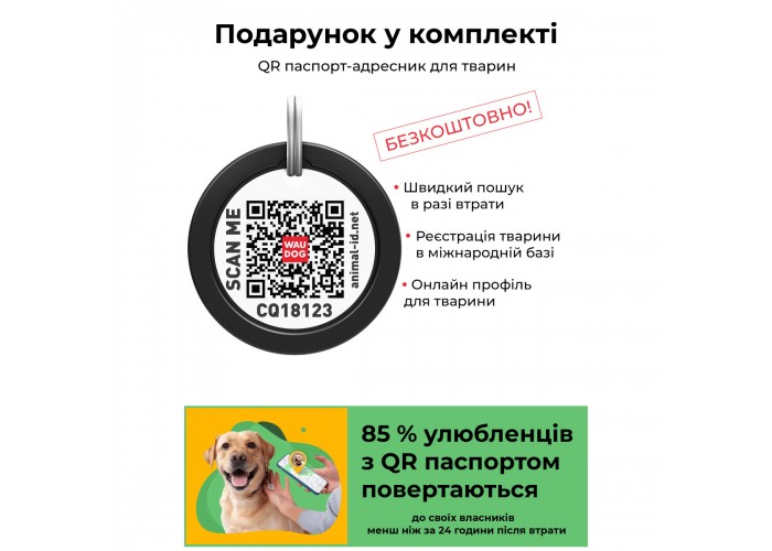 - QR паспорт, цифровий адресник з QR-кодом (*в разі втрати тварини знайшла потрібно зчитати QR-код з задньої сторони адресника для швидкого зв'язку з власником. Власнику в той же час приходить сповіщення з GPS локацією місця сканування. **QR паспорт активний тільки після реєстрації animal-id.net)