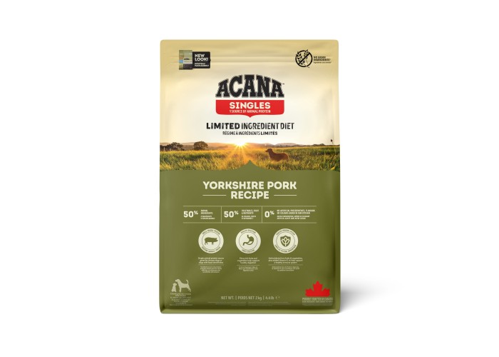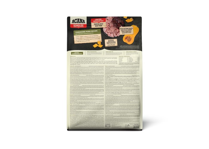 Acana Single Yorkshire Pork - високоякісний гіпоалергенний сухий корм для собак усіх порід та вікових груп. Він заснований на єдиному джерелі білка - свинині, ідеальному для собак з алергією на інші м'яса. Цей холістик-корм забезпечує збалансоване харчування завдяки вмісту всіх необхідних поживних речовин. Головний інгредієнт – свинина, багата білком, вітамінами та мінералами. Фрукти та овочі, такі як яблука, гарбуз та шпинат, збагачують корм вітамінами та антиоксидантами, підтримуючи здоров'я шкіри та вовни. Гіпоалергенна формула, позбавлена злаків та штучних добавок, робить його безпечним для чутливих собак. Вміст високого рівня білка та жирів підтримує м'язову масу, імунітет, здорову шкіру та блискучу шерсть. Acana Single Yorkshire Pork - вибір для здорового та активного способу життя вашого собаки.
