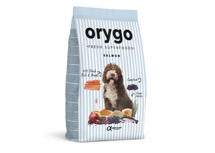 Orygo Salmon & Blueberries — натуральний, збалансований корм для дорослих собак усіх порід, створений для підтримки здоров’я та гарного самопочуття. Виготовляється методом холодного віджиму зі 100% свіжих інгредієнтів, що зберігає природну користь продуктів. Містить 85% свіжого м’яса — лосось (55%) і курятину (30%), включаючи м’язове м’ясо, серце та печінку, які забезпечують повноцінний білок, таурин, залізо та вітаміни. Суперфуд чорниця багата антиоксидантами, які сповільнюють старіння клітин, зміцнюють імунітет, підтримують здоров’я сечовидільної системи та мають протизапальні властивості. Ягоди містять клітковину, багато вітамінів і мало калорій, що робить їх ідеальними для щоденного раціону. Формула з пребіотиками сприяє здоров’ю мікрофлори кишківника. Корм не містить зерна, глютену, штучних барвників і ароматизаторів, підходить навіть вибагливим собакам, забезпечуючи їх усіма необхідними поживними речовинами.