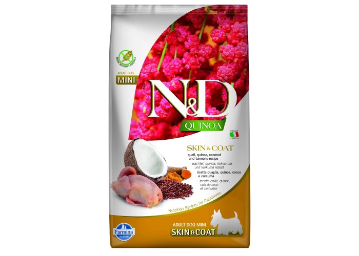 Farmina Dog Grain Free - це високоякісний беззерновий сухий корм, створений для дорослих собак дрібних порід з проблемами шкіри та вовни. Містить перепела, кокос та куркуму. Виготовлений із натуральних інгредієнтів без штучних добавок. Перепілка - джерело білка для м'язів, а кіноа забезпечує амінокислоти та вітаміни для здоров'я шкіри та вовни. Беззерновий склад підходить для чутливих шлунків та алергіків. Збагачений вітамінами A, D3, E, B12 та мінералами цинком, міддю, марганцем. Маленькі крокети легко засвоюються, підходять для всіх розмірів та порід собак.