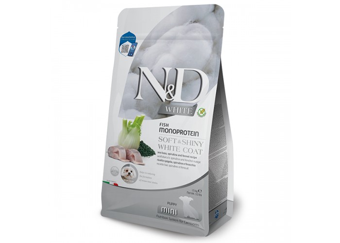 Сухий беззерновий корм для цуценят Farmina N&D Grain Free Soft & Shiny White Coat Puppy Mini 1.5 кг – повнораціонний раціон для малих порід із білою шерстю, що підтримує здоровий ріст та ідеальний зовнішній вигляд. Формула містить сібас як легкозасвоюване джерело білка для розвитку м’язів, спіруліну та фенхель для зменшення слізних плям і підтримки білосніжної шерсті, а риб’ячий жир забезпечує Омега-3 для шкіри, шерсті та когнітивного розвитку. Дегідровані креветки сприяють формуванню здорових суглобів завдяки глюкозаміну та хондроїтину. Корм збагачений бататом, насінням льону та іншими натуральними інгредієнтами, містить комплекс вітамінів і мінералів. Гранули оптимального розміру (8–10 мм діаметр, 4–6 мм товщина) підходять для щелеп цуценят дрібних порід. Корм не містить зернових, ГМО, штучних барвників, ароматизаторів і консервантів, забезпечуючи безпечне та збалансоване харчування.