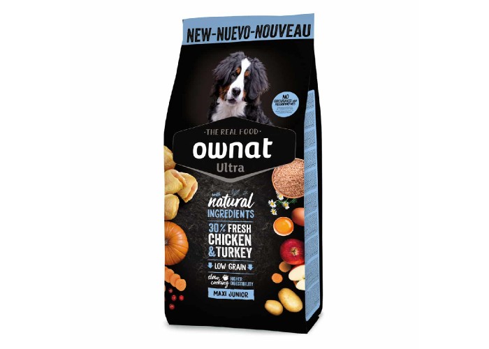 Ownat Ultra Maxi Puppy Chicken & Turkey — сухий корм для цуценят великих порід, розроблений для підтримки здорового росту та розвитку. Містить високий рівень енергії та білка для оптимального росту м’язів, а збалансоване співвідношення кальцію і фосфору сприяє правильному розвитку кісток і зубів. Корм виготовлений із свіжого м’яса та обмеженої кількості цільних зернових за технологією Soft Cooking, що зберігає поживну цінність і підвищує засвоюваність. Свіже м’ясо і яйця забезпечують білки високої біологічної цінності, коричневий рис, картопля, маніока та батат — легкозасвоювані джерела енергії, ячмінь та овес — клітковину, фрукти та овочі — антиоксиданти, насіння льону — омега-3 та омега-6, морські водорості — мінерали, ароматичні рослини та пивні дріжджі підтримують травлення та імунітет.