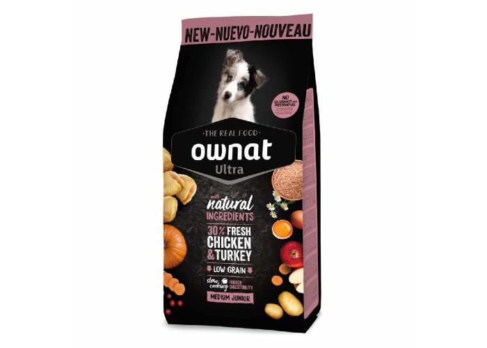 Ownat Ultra Medium Puppy Chicken & Turkey — сухий корм для цуценят середніх порід від відлучення до дорослого віку. Містить високий рівень енергії та білка для розвитку м’язів, а збалансоване співвідношення кальцію та фосфору підтримує здоров’я кісток і зубів. Виготовлений із натуральних інгредієнтів із високим вмістом свіжого м’яса та обмеженою кількістю цільнозернових за технологією Soft Cooking, що зберігає поживність та покращує засвоюваність. Свіже м’ясо та яйця — білки високої біологічної цінності, коричневий рис, картопля, батат та маніока — легкозасвоювані вуглеводи, свіжі фрукти та овочі — антиоксиданти, насіння льону — омега-3 та омега-6, морські водорості — мінерали, бобові — рослинні білки, пивні дріжджі та ароматичні рослини — підтримка імунітету та травлення. Раціон сприяє здоровому росту, розвитку м’язів і загальному тонусу цуценяти.