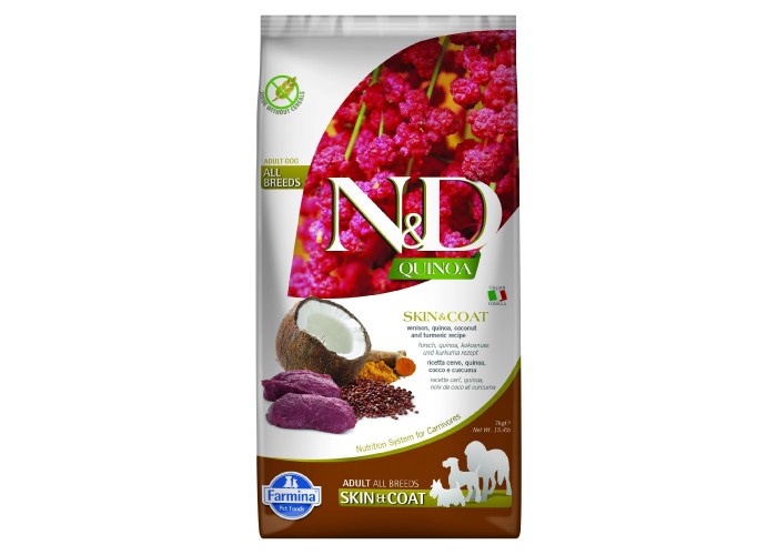 Farmina N&D Quinoa Grain Free Skin & Coat Adult Medium & Maxi Venison — це повнораціонний беззерновий дієтичний сухий корм для дорослих собак середніх і великих порід, спеціально розроблений для підтримки здоров’я шкіри та шерсті. Раціон рекомендований собакам із харчовою непереносимістю, алергічними реакціями, свербежем або дерматологічними проблемами.