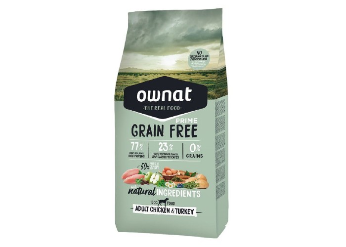 Ownat Grain Free Chicken & Turkey — це повнораціонний беззерновий сухий корм для дорослих собак із нормальною активністю, розроблений для забезпечення оптимального харчування, наближеного до природного раціону хижаків. Містить 50% свіжого м’яса курки та індички, що є джерелом білків високої біологічної цінності, сприяє розвитку м’язів, підтримці енергії та чудовому самопочуттю. Завдяки відсутності зернових корм легко засвоюється, підходить для собак із чутливим травленням або алергіями. Формула збагачена свіжими фруктами, лікарськими травами, бобовими, насінням льону, яйцями, морськими водоростями та пивними дріжджами — це джерела антиоксидантів, вітамінів, мінералів і жирних кислот Омега-3 та Омега-6, які сприяють здоров’ю шкіри, блиску шерсті, сильному імунітету та гарному травленню. Без барвників, консервантів і штучних добавок, цей корм забезпечує збалансоване, натуральне харчування для вашого собаки щодня.