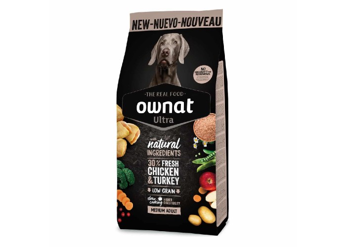 Ownat Ultra Medium Chicken & Turkey — сухий корм для собак середніх порід, створений для дорослих собак від 1 до 7 років із нормальним рівнем активності. Повноцінний і збалансований раціон забезпечує оптимальне засвоєння поживних речовин завдяки високоякісним білкам зі свіжого м’яса курки та індички, а збалансована клітковина підтримує роботу кишківника. Корм виготовлений з натуральних інгредієнтів і містить обмежену кількість цільнозернових, приготованих за технологією Soft Cooking, що дозволяє зберегти максимальну поживну цінність та покращує апетит і засвоюваність. Свіже м’ясо та яйця — джерело білків високої біологічної цінності, коричневий рис, картопля, маніока та батат — легкозасвоювані вуглеводи, овочі та фрукти — антиоксиданти, насіння льону — омега-3 та омега-6, морські водорості — органічні мінерали, бобові — рослинні білки, пивні дріжджі та ароматичні рослини — підтримка імунної системи та травлення. Раціон створений з урахуванням фізіології середньої породи, забезпечує енергію, здоров’я кісток і оптимальну кондицію шерсті.