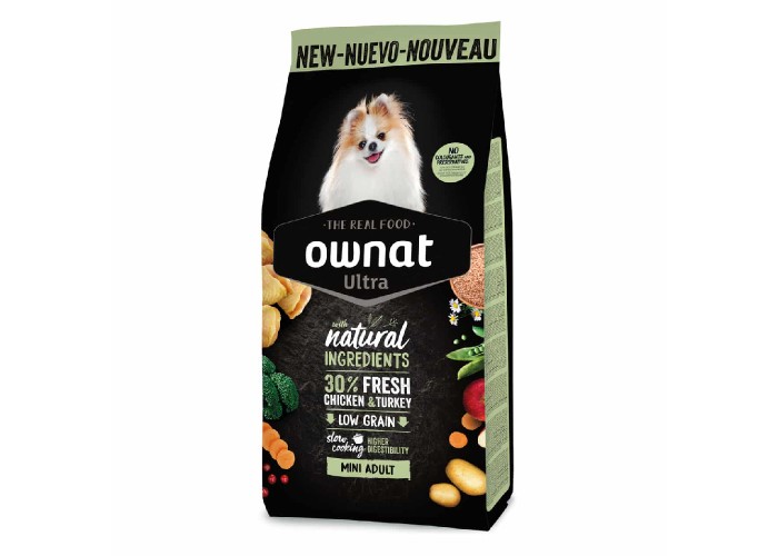 Ownat Ultra Mini Chicken & Turkey — сухий корм для дорослих собак дрібних порід з куркою та індичкою, розроблений для задоволення високих енергетичних потреб малих собак та підтримки оптимальної ваги. Містить збалансований рівень білків і жирів, а невеликі гранули забезпечують зручність і апетитність під час годування. Рецепт виготовлений із свіжого м’яса та натуральних інгредієнтів, з обмеженою кількістю цільнозернових, за технологією Soft Cooking, що дозволяє зберегти максимальну поживну цінність і покращити засвоюваність. Корм збагачений свіжими фруктами та овочами — джерелами антиоксидантів, бобовими та яйцями для високоякісного білка, насінням льону для шкіри та шерсті, морськими водоростями — природним джерелом мінералів, картоплею, маніокою та бататом — легкозасвоюваними вуглеводами, цільним ячменем і овесом — клітковиною, лікарськими травами для травлення та пивними дріжджами для підтримки імунної системи. Раціон забезпечує повноцінне харчування, сприяє активності та здоров’ю дрібних собак.