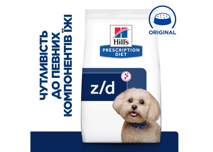 Hill's Prescription Diet z/d Mini - сухий корм супер-преміум класу, розроблений для дорослих мініатюрних собак з несприятливими реакціями на їжу. Його формула містить спеціальне джерело вуглеводів та гідролізований білок, а також пребіотики для здорового травлення та випорожнення. Гідролізований білок допомагає уникнути небажаних реакцій на їжу, а підвищений вміст жирних кислот та вітаміну Е підтримує здоров'я шкіри. Клінічно доведено, що цей корм зменшує прояви харчової непереносимості та підтримує імунну систему завдяки технології ActivBiome+. Рекомендується використовувати корм протягом 3-8 тижнів, а потім до 1 року, якщо симптоми покращаться. Перед використанням корму обов'язково проконсультуйтеся із ветеринаром. Слідкуйте за доступом вихованця до чистої води