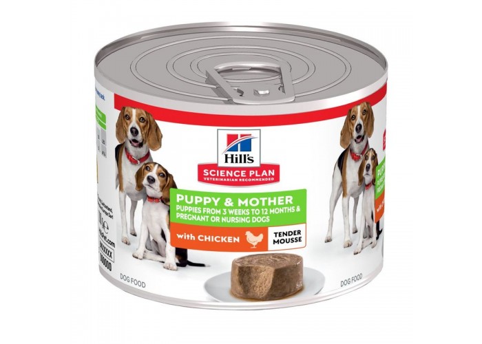 Hill's Science Plan Puppy & Mother Tender Mousse with Chicken – це повноцінний вологий корм для цуценят від відлучення до 1 року, а також для вагітних і годуючих сук. Завдяки м’якій текстурі мусу та ніжному смаку курки цей корм полегшує перехід цуценят на тверду їжу та робить щоденне годування справжнім задоволенням. Збалансований склад забезпечує необхідну кількість енергії для здорового росту цуценят та підтримки організму сук під час вагітності та лактації. DHA сприяє нормальному розвитку мозку та зору у цуценят, а додані мінерали допомагають зміцнити кістки та зуби. Корм також містить клітковину для підтримки здоров’я травної системи та сприяння комфортному травленню. Виготовлений із ретельно відібраних високоякісних інгредієнтів, він не тільки корисний, а й дуже смачний. Рекомендовано ветеринарами для здорового старту життя та турботи про маму-собаку.