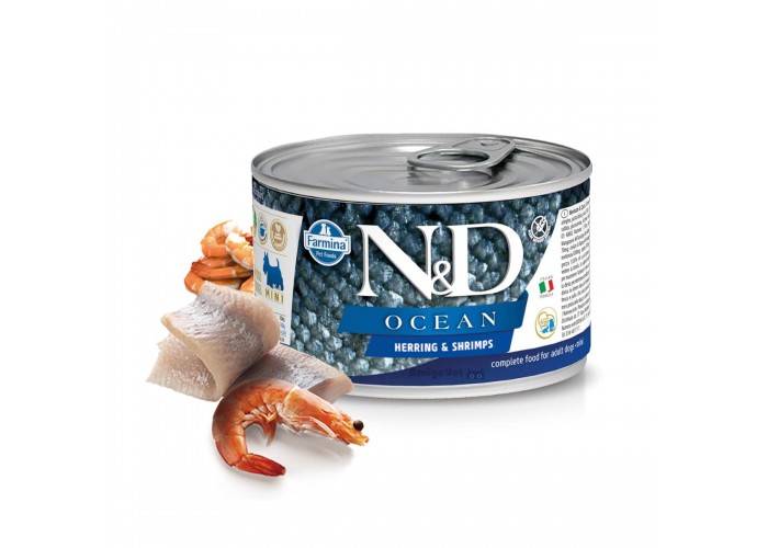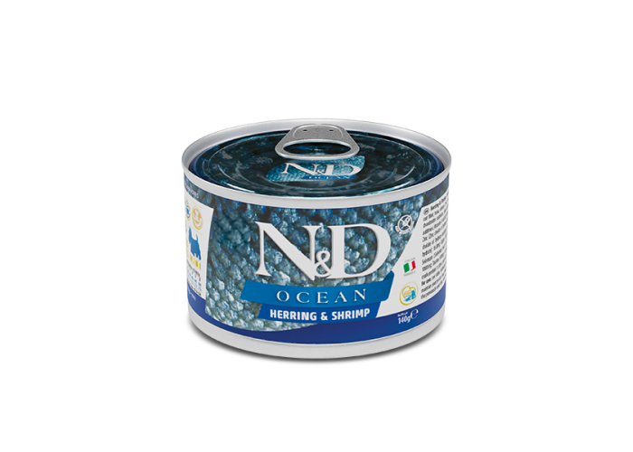 Вологий корм для собак Farmina N&D Grain Free Ocean Herring & Shrimps Adult Mini 140 г – це повнораціонний преміум-раціон, створений спеціально для дорослих собак дрібних порід, який поєднує користь морепродуктів та сучасні стандарти якості AAFCO. Основним інгредієнтом виступає оселедець, виловлений у північних морях, що є джерелом легкозасвоюваного білка, Омега-3 жирних кислот (EPA та DHA), вітаміну D, мінералів та антиоксидантів для підтримки серцево-судинної системи, здоров’я мозку та імунітету. Креветки доповнюють раціон комплексом вітамінів, мінералів і селену, який разом із таурином сприяє здоровій роботі серця та знімає запальні процеси. До складу також входять фруктоолігосахариди для підтримки корисної мікрофлори кишечника, клітковина для комфортного травлення та DL-метіонін, що піклується про сечостатеву систему та печінку. Корм не містить глютену, ГМО, штучних барвників і консервантів, завдяки чому підходить навіть собакам з харчовою чутливістю або схильністю до алергій.